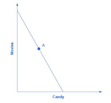 Paso 1. Comience con una restricción presupuestal que muestre la elección entre dos bienes, que este ejemplo llamará “dulces” y “películas”. Elija un punto A que sea la elección óptima, donde la curva de indiferencia será tangente, pero a menudo es más fácil no dibujar en la curva de indiferencia todavía. Ver Figura\(\PageIndex{B7}\).