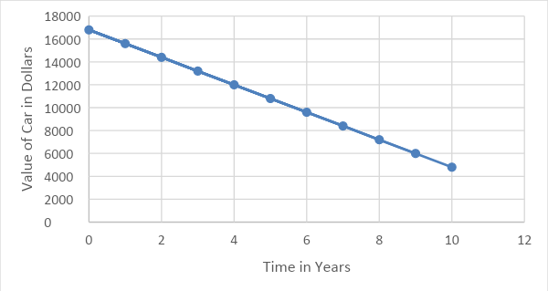 La diferencia común de depreciación cada año es\(d = $-1200\). Así, el modelo de crecimiento lineal para este problema es:\(P(t) = 16,800 - 1200t\)