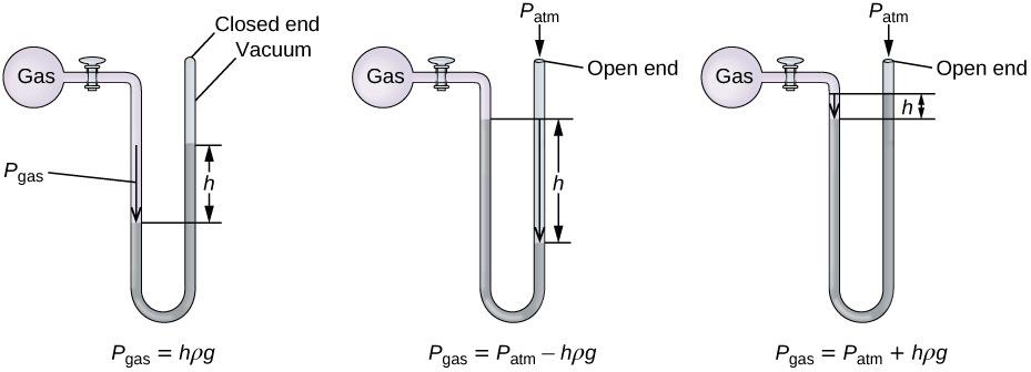 Un manómetro es un dispositivo similar a un barómetro que se puede usar para medir la presión de un gas atrapado en un recipiente. Un manómetro de extremo cerrado es un tubo en forma de U con un brazo cerrado, un brazo que se conecta al gas a medir y un líquido no volátil (generalmente el mercurio) en el medio. Al igual que con un barómetro, la distancia entre los niveles de líquido en los dos brazos del tubo (h en el diagrama) es proporcional a la presión del gas en el recipiente. Un manómetro de extremo abierto (Figura \(\PageIndex{3}\)) es lo mismo que un manómetro de extremo cerrado, pero uno de sus brazos está abierto a la atmósfera. En este caso, la distancia entre los niveles de líquido corresponde a la diferencia de presión entre el gas en el recipiente y la atmósfera.